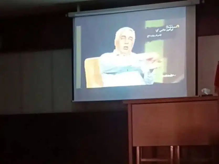 همچنین بعد از بازدید از مزار شهید آوینی در آمفی تئاتر دانشکده هنر مستند «آقا مرتضی» که درباره زندگی شهید آوینی میباشد پخش شد و پس از آن جناب آقای دکتر وحید زاده با دانشجویان حاضر در آمفی تئاتر درباره هنر انقلاب و نقش شهید آوینی صحبت کردند.