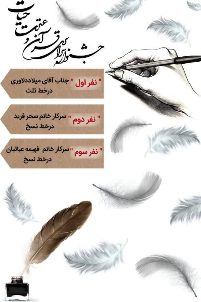 کسب مقام دوم سرکار خانم سحر فرید در دومین جشنواره بینالمللی قرآن و عترت حیات در بخش انگیزشی رشتهی خوشنویسی